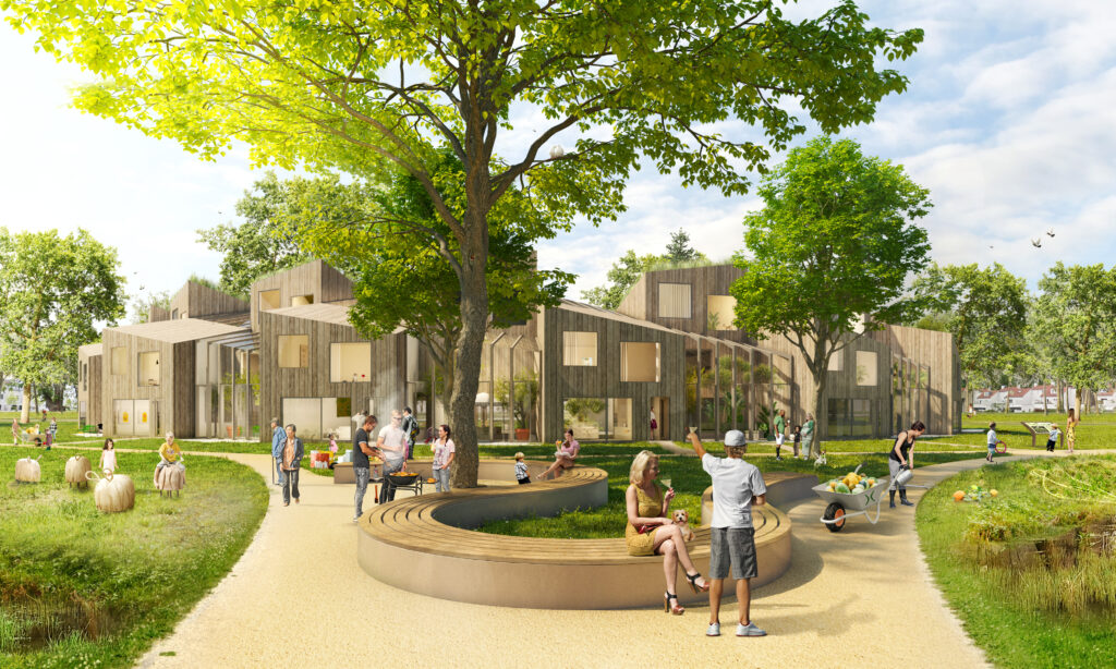 Ontwikkelaarstender voor 38 circulaire grondgebonden woningen als een beeld in de beeldentuin van het lommerijke Bosrijk in Eindhoven.