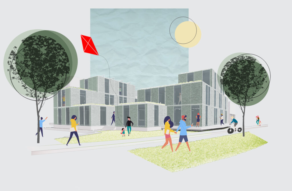 Ontwerp voor circulaire en demontabele woningen op een tijdelijke locatie aan de rand van Eindhovense Strijp-S.